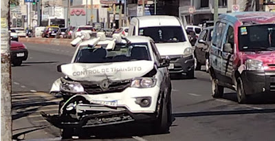 El auto de la foto, es un vehículo de la Dirección de Tránsito que pasa y repasa por la avenida Hipólito Yrigoyen, sacando fotos a los vehículos mal estacionados -excepto a los de las agencias de autos que usan las veredas como playones- y el sábado tomó de su propia medicina cuando en dicha avenida al 4500 chocó a otro vehículo que estaba estacionado.